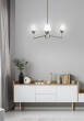 delikatna satyna w połączeniu z białym kloszem podkreśli sterylność wnętrza; elegancka podstawa o wyrazistej formie gięcia; źródło światła w zestawie; do kompletu kinkiet oraz zwis pięcioramienny