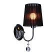 klasyczny chrom w połączeniu z czarnym abażurem tasiemkowym; elegancji dodają kryształowe elementy zawieszone na ramionku; idealny do klasycznych wnętrz z tradycyjnym wystrojem;