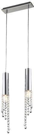 Zwis LED-owy w ekskluzywnym kryształowym wydaniu; niezwykle dekoracyjny, proste metalowe klosze zdobione transparentnymi kryształkami efektownie rozpraszającymi strumienie światła, zawieszone na metalowych linkach umożliwiających regulację wysokości;