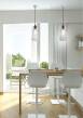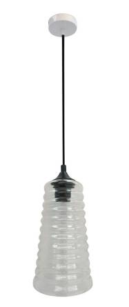 szklany klosz bezbarwny, zawieszony na czarnym prostym zawiesiu; stożkowa czarna nadkloszówka; doskonała dekoracja nad stół, bar czy ladę