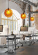 szklany klosz barwiony na czarnym prostym zawiesiu; stożkowa czarna nadkloszówka, żarówka typu EDISON w komplecie; doskonała dekoracja nad stół, bar czy ladę; dostępny w trzech kolorach