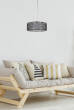 nowoczesny podwójny abażur: zewnętrzny dekoracyjny metalowy, wewnętrzny z białego płótna; całość zawieszona na zawiesiu z metalową podsufitką, umożliwiającym regulację preferowanej wysokości